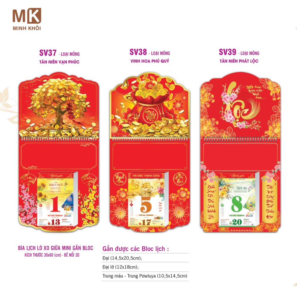 - Loại lịch: Lịch để bàn, lịch treo tường, lịch block.