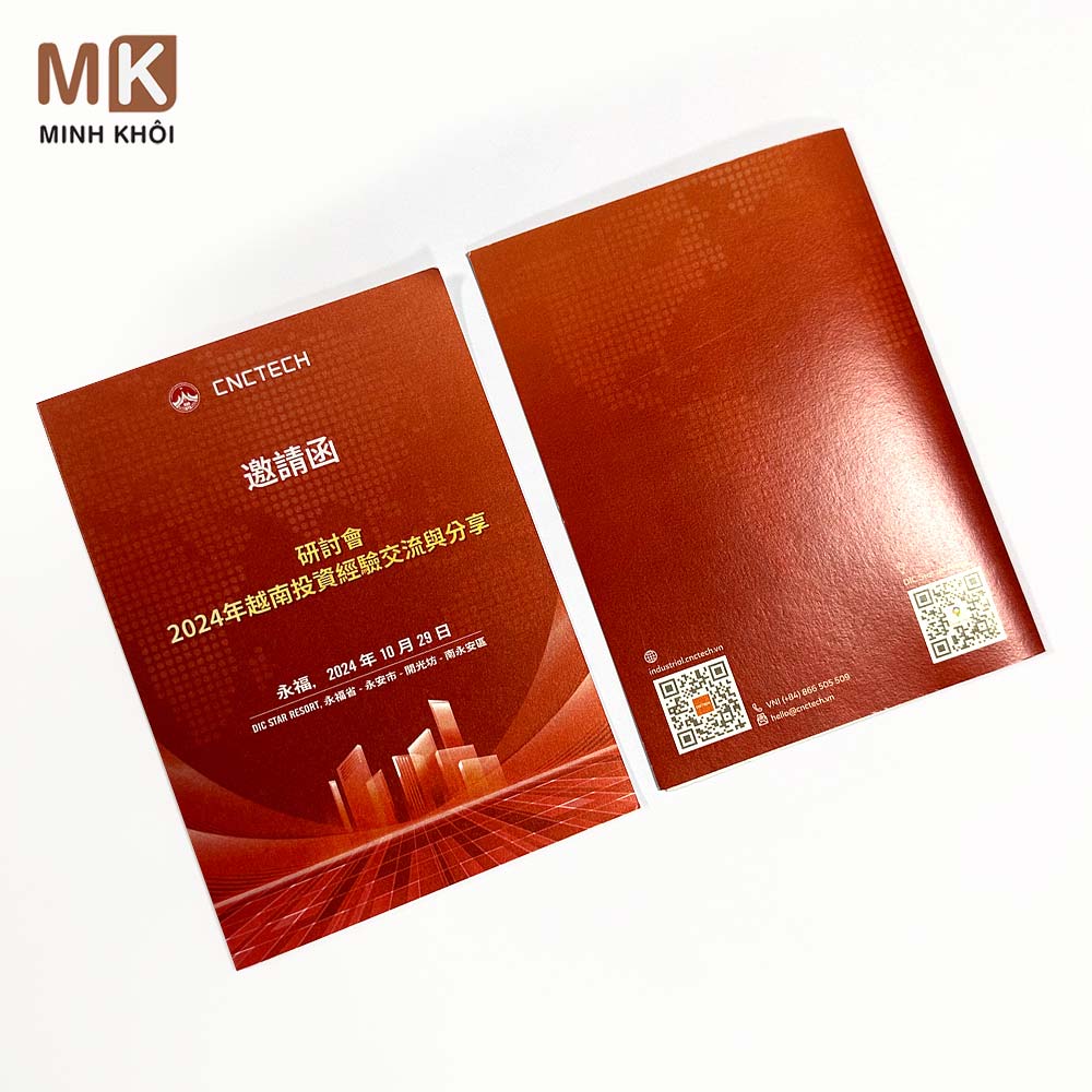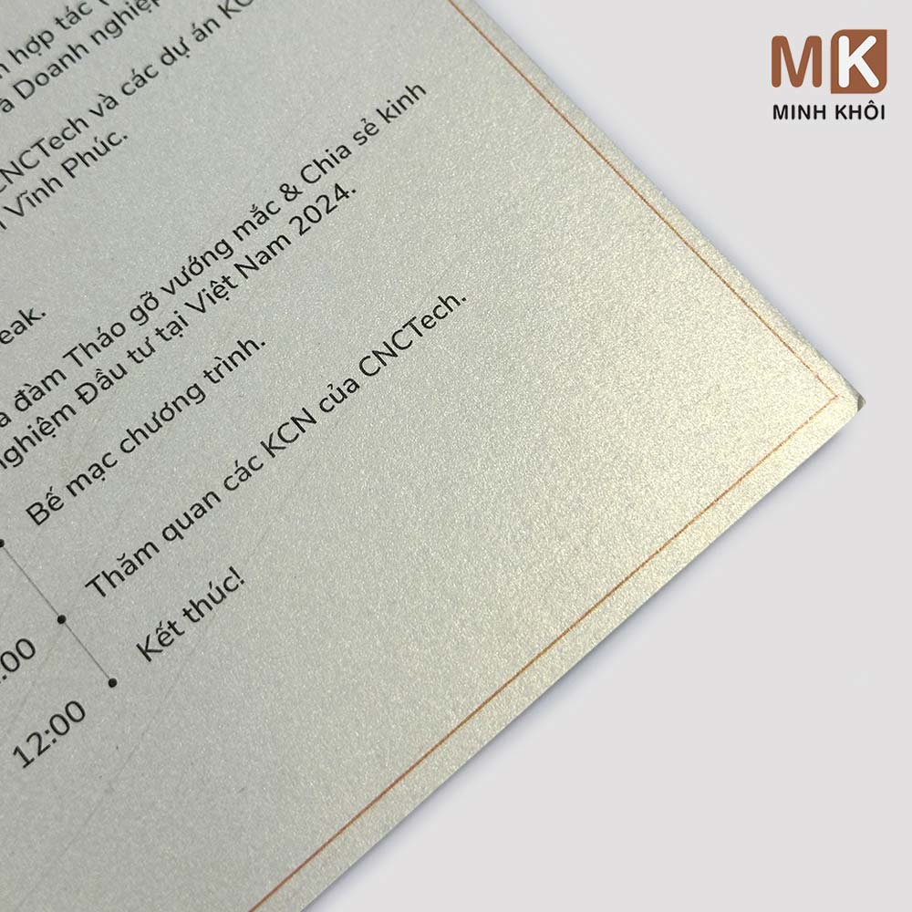 Về công nghệ in, In Minh Khôi áp dụng các kỹ thuật in tiên tiến như in Offset, in KTS (kỹ thuật số), giúp đảm bảo màu sắc rõ nét, hình ảnh sống động và chi tiết in chính xác đến từng chi tiết nhỏ nhất. Chúng tôi cũng cung cấp các kỹ thuật gia công sau in như ép kim, phủ UV, bế nổi, giúp thiệp trở nên nổi bật và ấn tượng hơn.