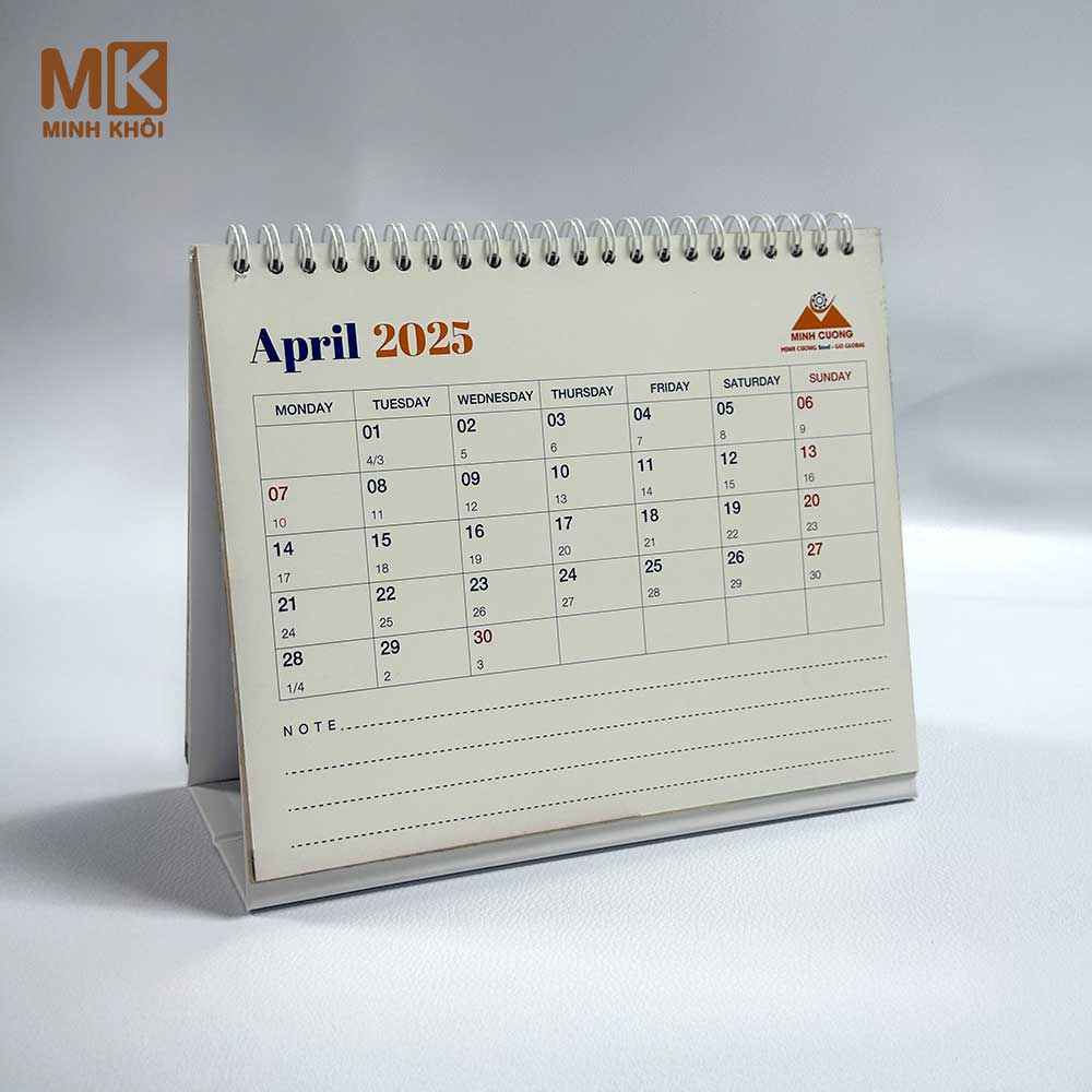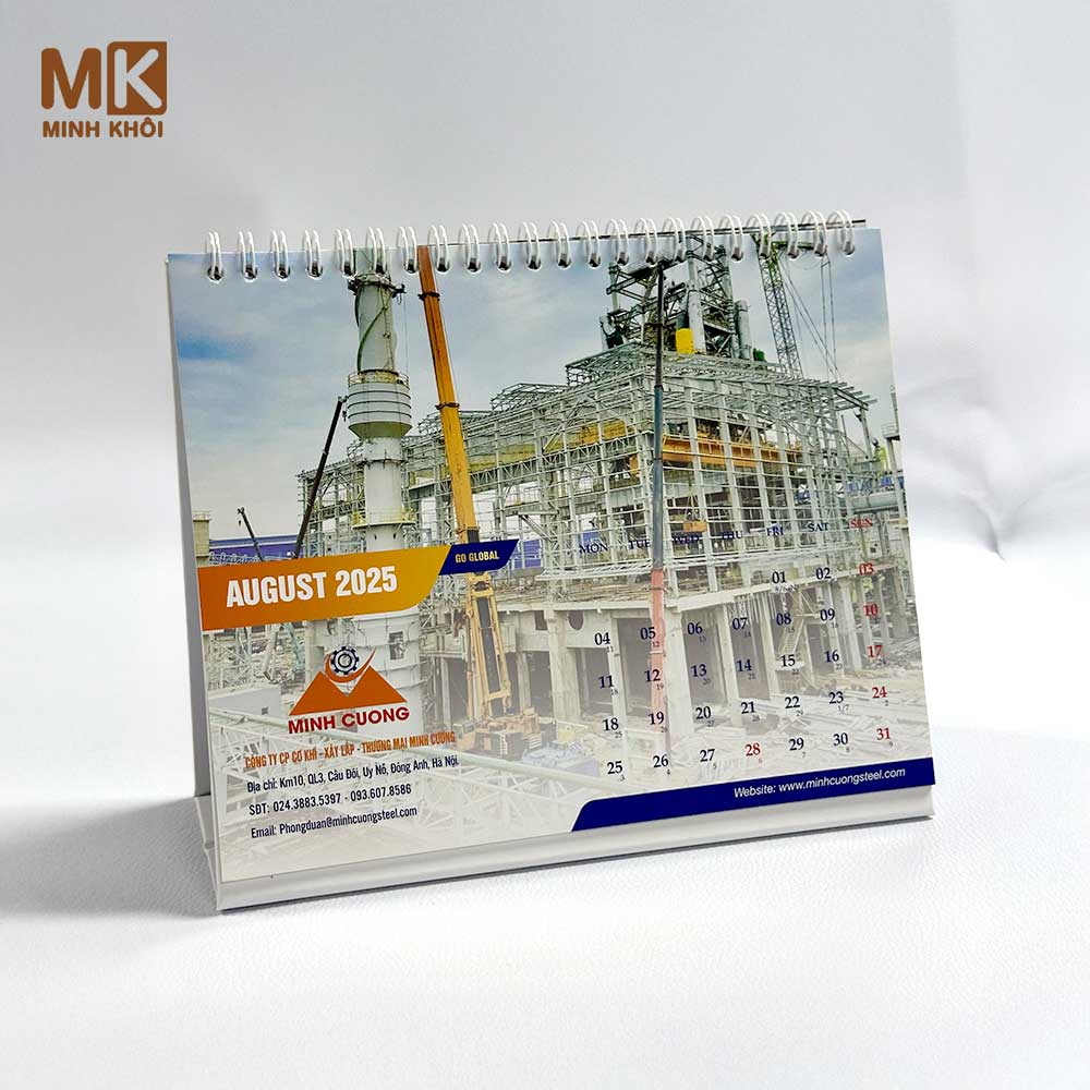 Mẫu lịch để bàn chữ A công ty thép Minh Cường do In Minh Khôi sản xuất trọn gói. Nếu bạn muốn làm lịch để bàn chữ A in hình theo yêu cầu, hãy liên hệ chúng tôi ngay để nhận báo giá nhanh nhất nhé!