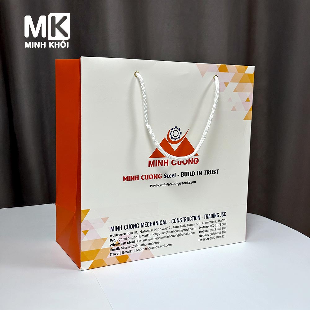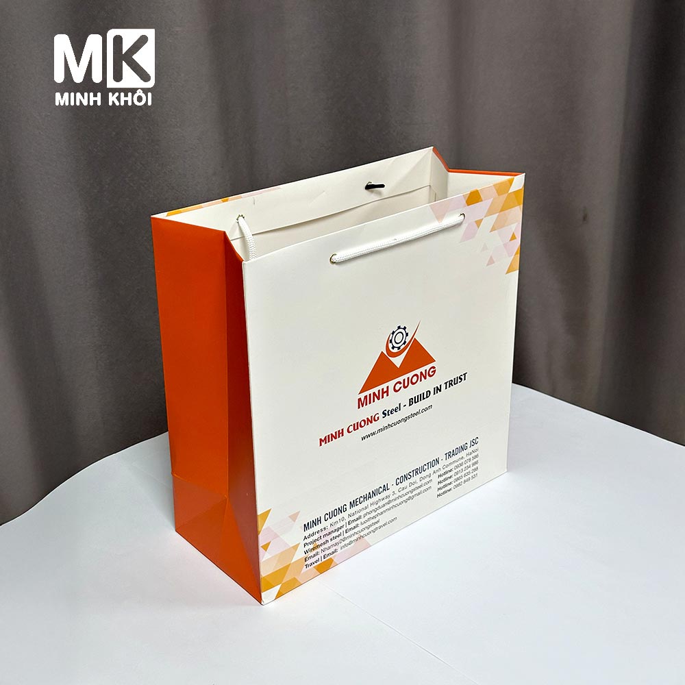 Mẫu túi giấy đỏ trắng Minh Cường do In Minh Khôi trực tiếp sản xuất, in ấn theo yêu cầu. Nếu bạn có nhu cầu, hãy liên hệ chúng tôi để được tư vấn chi tiết nhé!