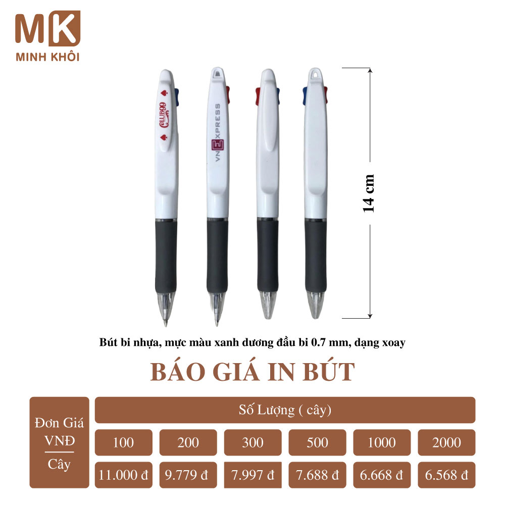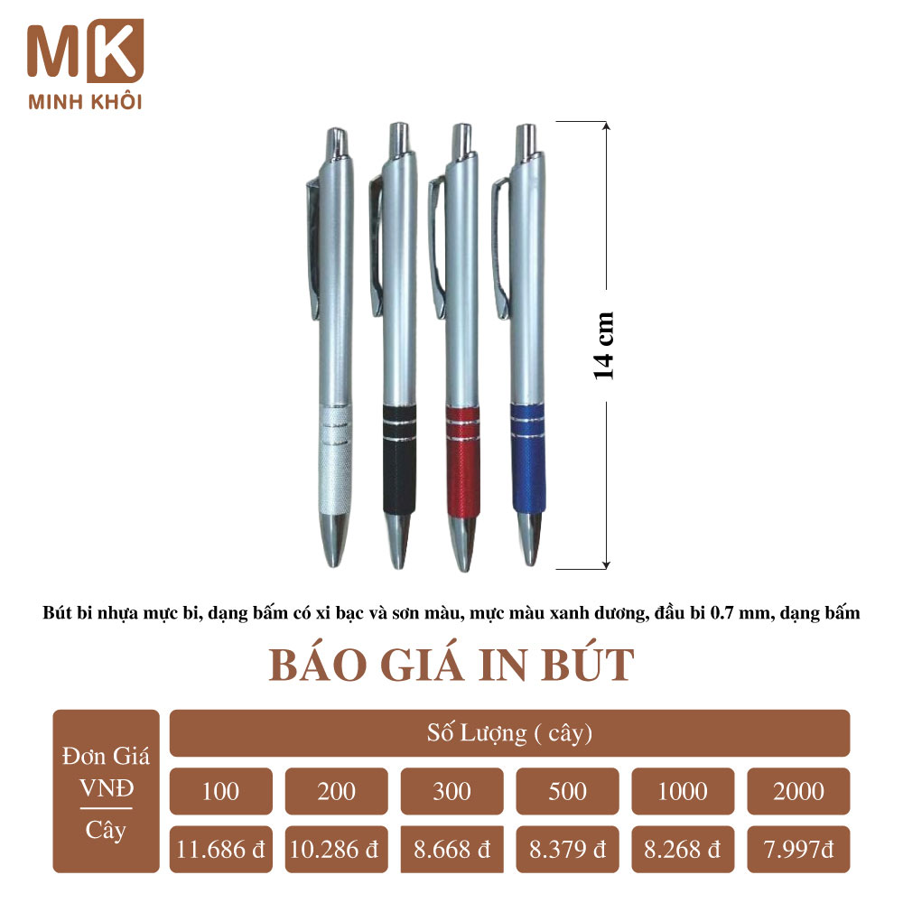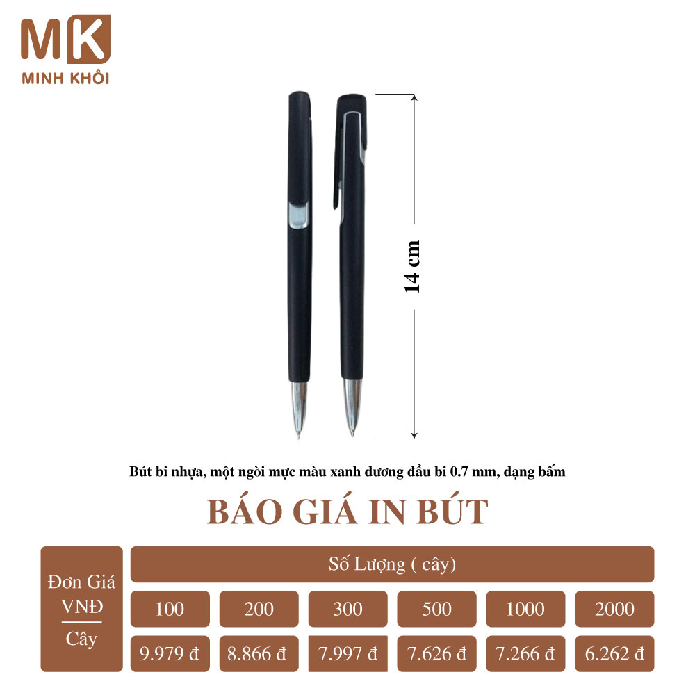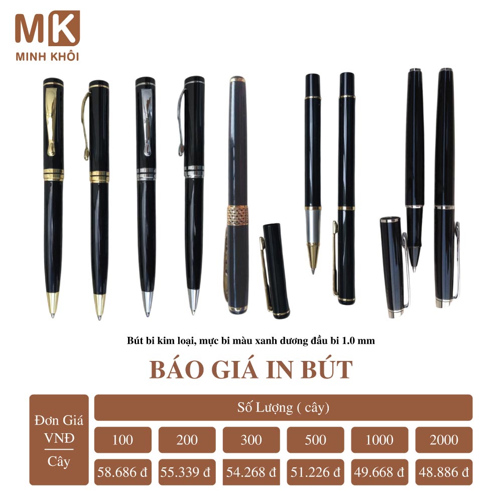 Chính vì vậy, để nhận báo giá chính xác, bạn hãy liên hệ với nhà cung cấp dịch vụ để được tư vấn và giá thành tốt nhất. Tại Hà Nội, bạn có thể kết nối với công ty In Minh Khôi để đặt in bút. Chúng tôi mang đến cho khách hàng nhiều lựa chọn mẫu mã và hình thức in ấn bút đẹp với giá cả hợp lý.
